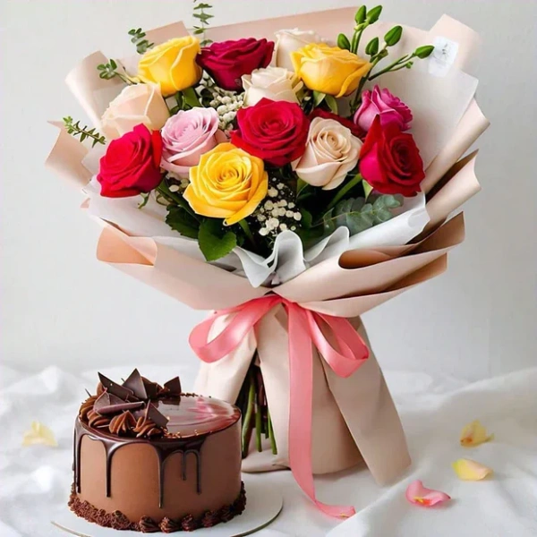 Every cake is freshly prepared by expert bakers to deliver exceptional taste and beautiful presentation. Whether you're celebrating a birthday, anniversary, special occasion, or simply want to surprise someone you love, this cake makes the perfect centerpiece for any celebration. Its delightful flavor and elegant design are sure to bring smiles and sweet moments to every gathering.12 Mix Roses N Chocolate Cake  Image
