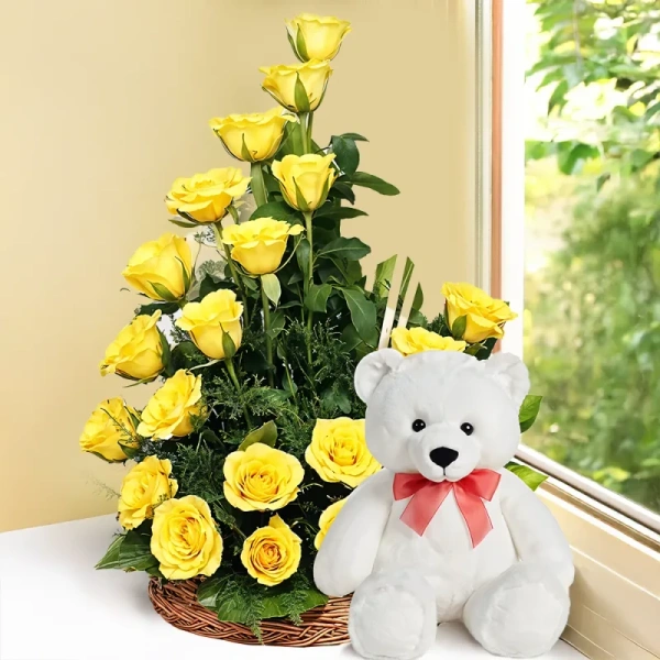 Yellow Roses In A Basket With Teddy